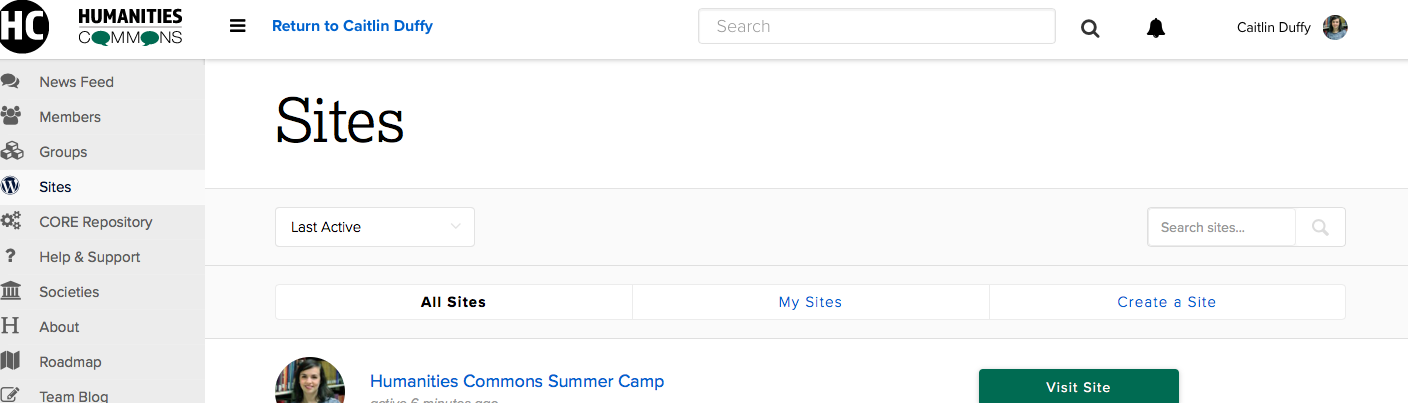 To create a Humanities Commons site, first click the “Sites” tab located on the left-hand menu below the HC logo.